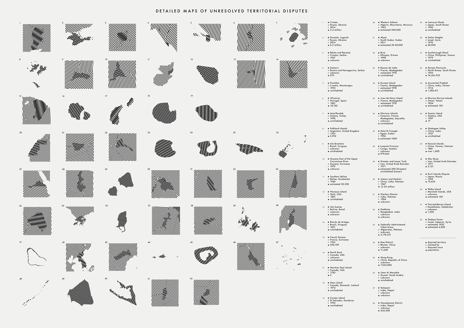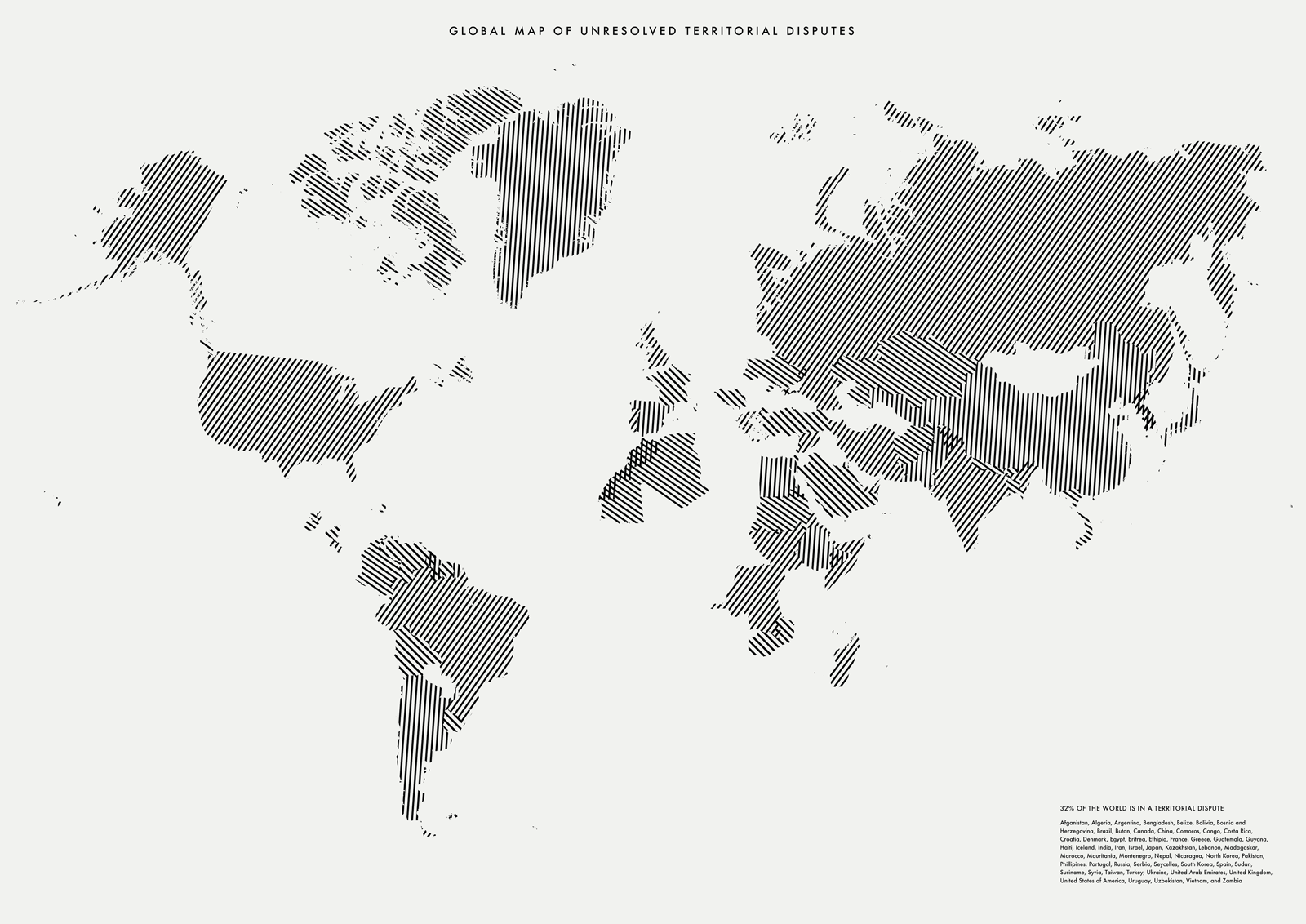 Finalist in the CIG Chaumont Student Competition, 2015. Collaboration with Amaya Hagelaar and Elena Shkarupa. Global power structures proclaim the idea of world unity and vanishing borders, when in reality 32% of the world is engaged in territorial disputes over land. The maps visualize the scale of the problem and bring attention to each dispute.