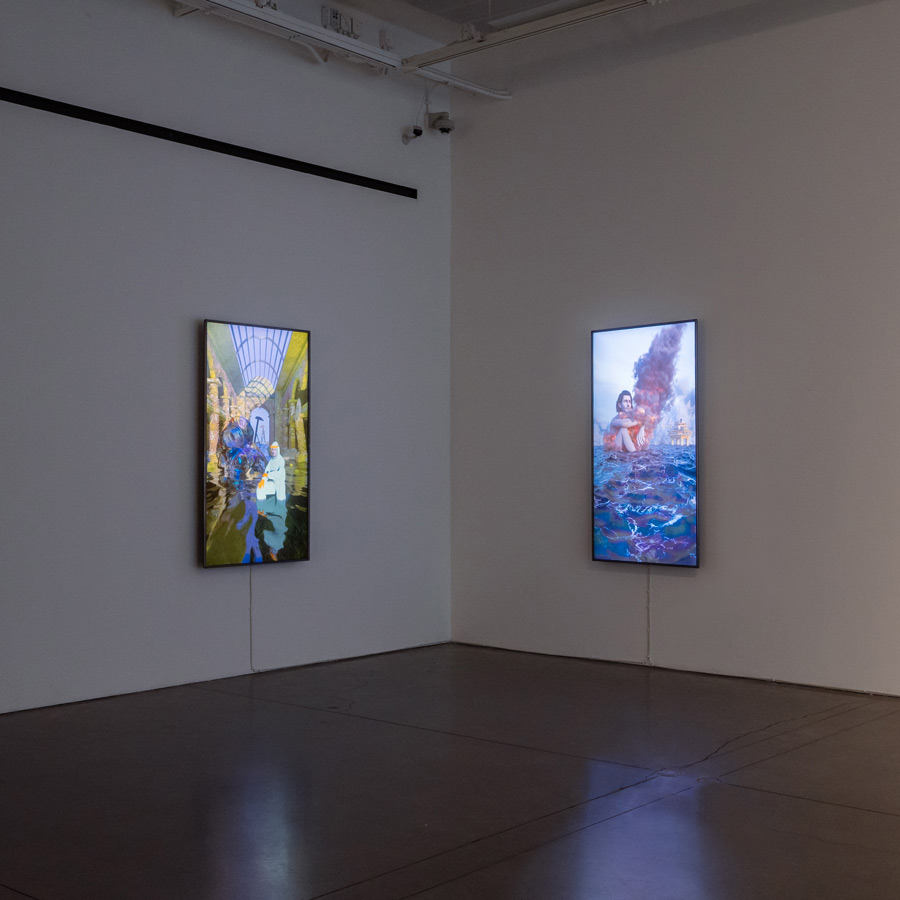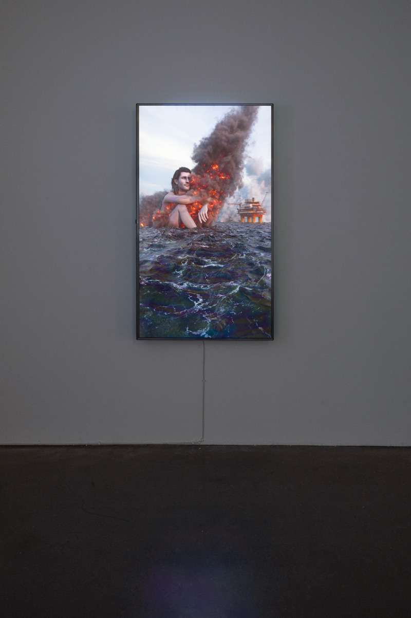 In the summer of 2021 a leaking gas pipe in the Gulf of Mexico caught fire. Shocking and apocalyptic images of the ocean literally in flames were seared into my mind. The scene itself is unbelievably surreal. What is my relationship to this event? I consume oil based products and use its energy to move through space; slowly my skin starts to shimmer with a familiar iridescence as my complicity takes shape. The state of oil production versus the environment is a crushing depression, an insurgent act of despair, a self-immolation. Flames engulf my digital avatar, which appears at monumental scale in this simulated self portrait. Their face disappears behind dark smoke plumes and flames. Installed as a looping 4k video on a large 70 inch television.