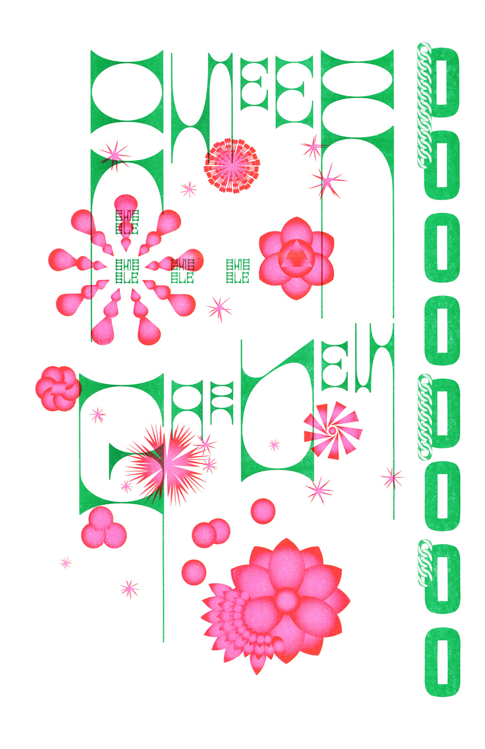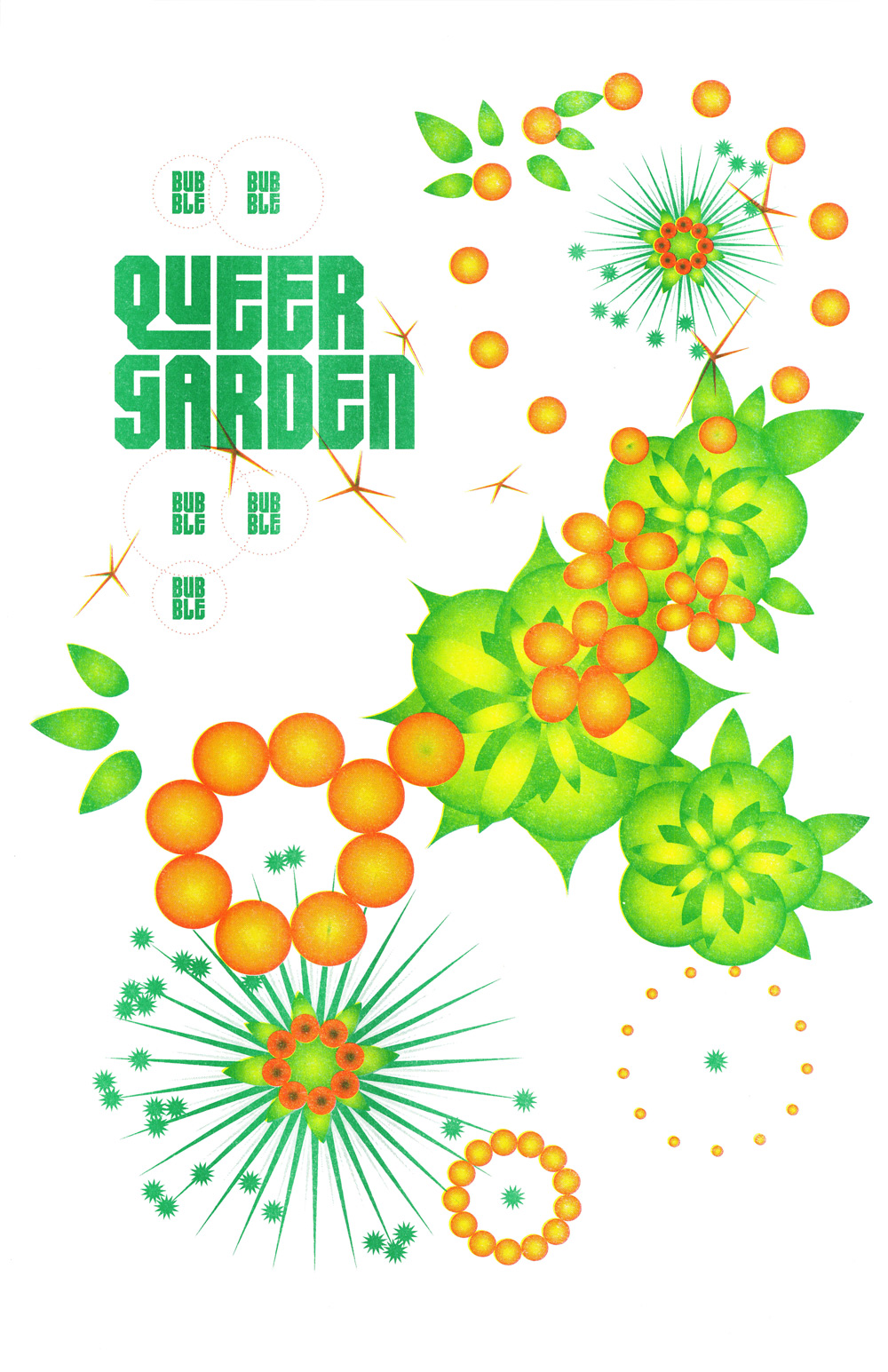 Ongoing poster series; in each design custom typography reads "Queer Garden, Bubble Bubble Bubble" amongst geometric floral forms.
